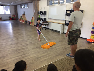 「It has to be straight!」とみんな真剣。チワワ達(年少さん)は、大きなモップに翻弄されながらも、頑張っておりました。