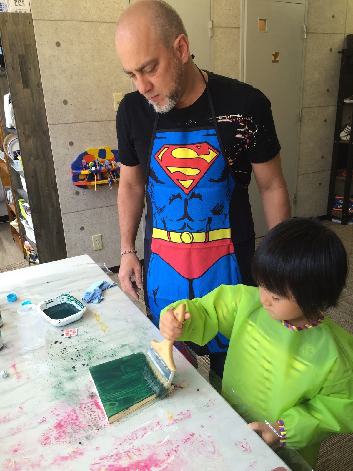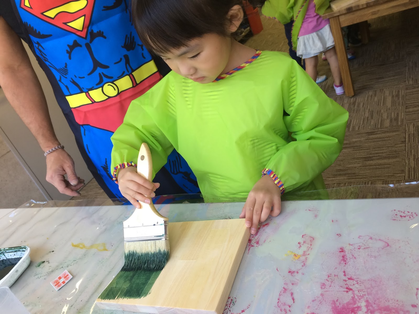 お次は、スーパーマンが後ろで目を光らせる中、木に自分たちでPaintをして。