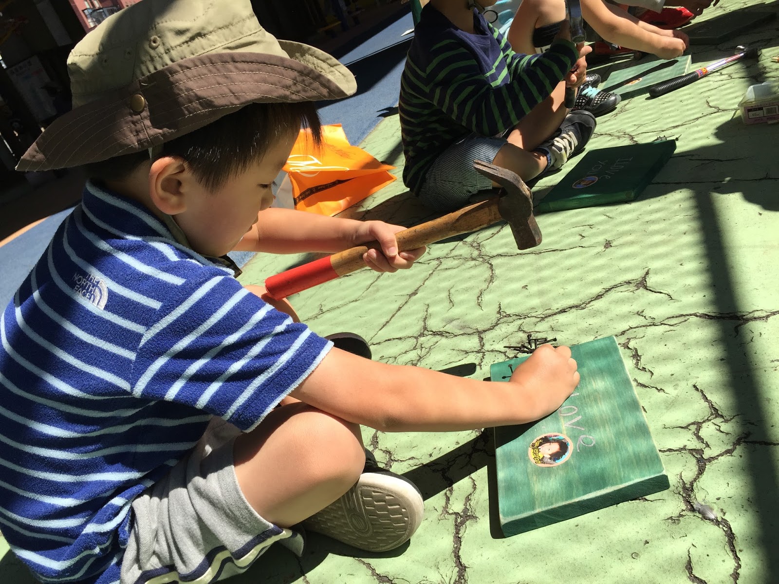 お外で思いっきりトンカチ!!チワワさん(年少)は、ちょっとヘルプしながら。